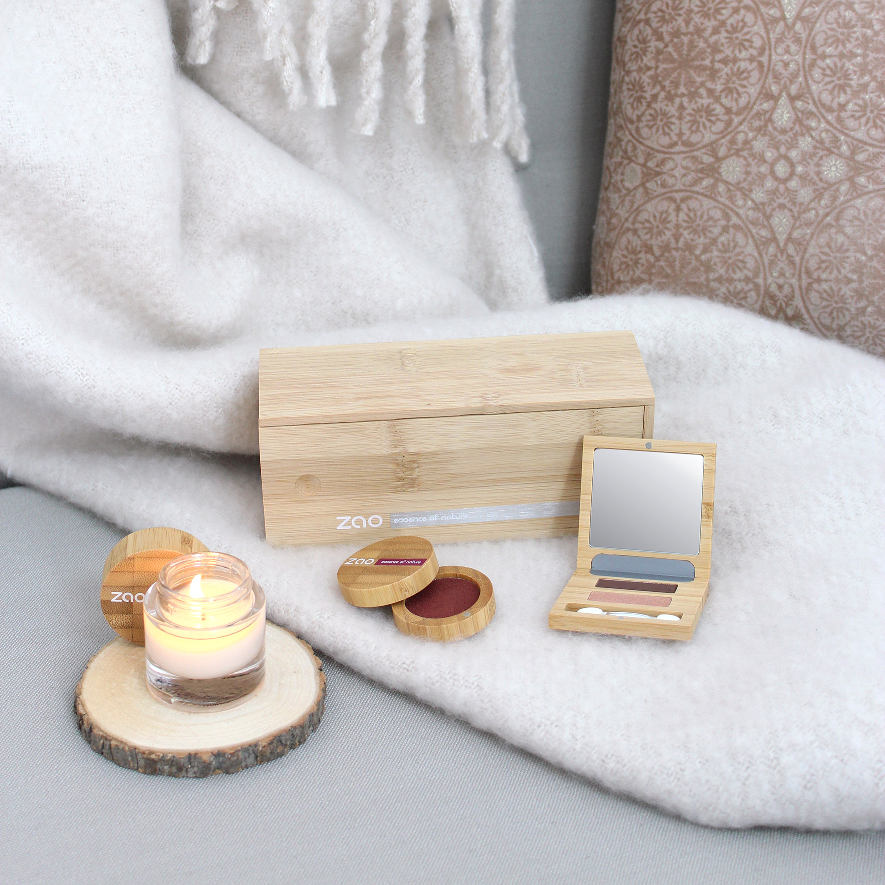 Per quest’Inverno Zao ha pensato a tutto con il Cozy Beauty Box. Questa elegante scatola di bambù è composta da una candela 100% naturale e vegetale associata a 2 prodotti per il trucco multiuso certificati bio, 100% naturali, vegani e ricaricabili: